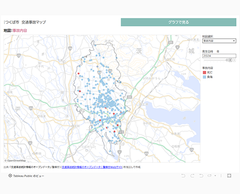 つくば市における交通事故の場所や時期、内容がわかるように可視化しています。
